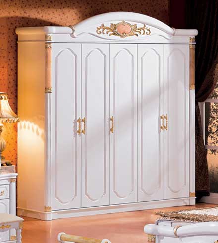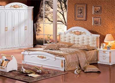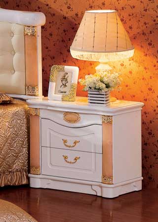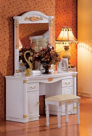 Материал - МДФ, покрытие - меламин, лак. Декор - искусственный камень, позолота. Размеры: кровать - 188х210х130см,                     тумба - 58х40х52см,                      гардероб - 226х60х236см,                     туалетный столик - 120х49х177см Цена кровать + 2 тумбы 71 040 руб. Цена гардероб 69 745 руб.