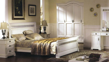 В комплектацию кровати входит основание для матраса. Размер спального места, мм: 1800х2000 Материал: МДФ, покрытие меламин. Декор: ручки под бронзу. Размеры, мм: Кровать 2230х1900х1220 Тумба прикроватная 600х400х650 Шкаф 4-х дверный 2100х650х2320