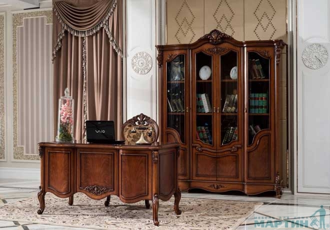 Мебель для кабинета Каролина: В комплекте Шкаф книжный 2270*508*1801 и Стол письменный 500*1498*750 Материал: ламинированный MDF Цвет: орех. Фасады оформлены декоративной резьбой.
